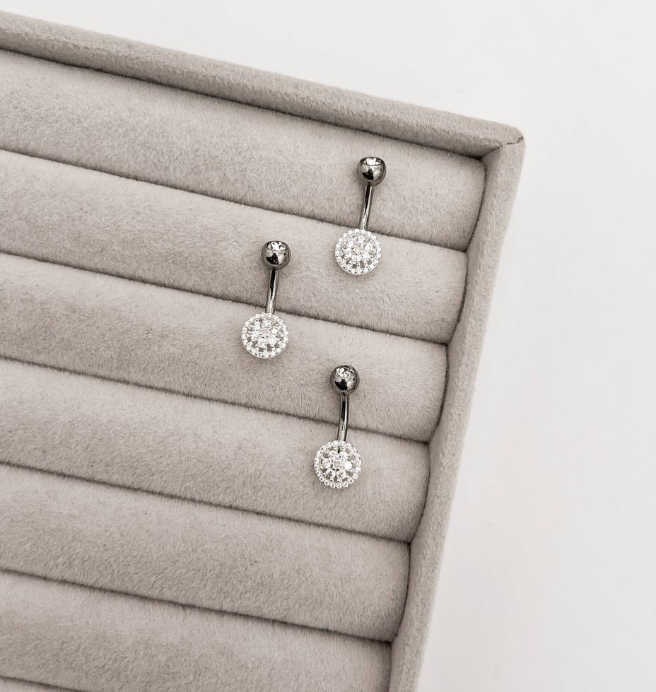 Piercing haste zircônia e flor com círculo cravejado 8mm umbigo - Haste em aço cirurgico e detalhe em prata